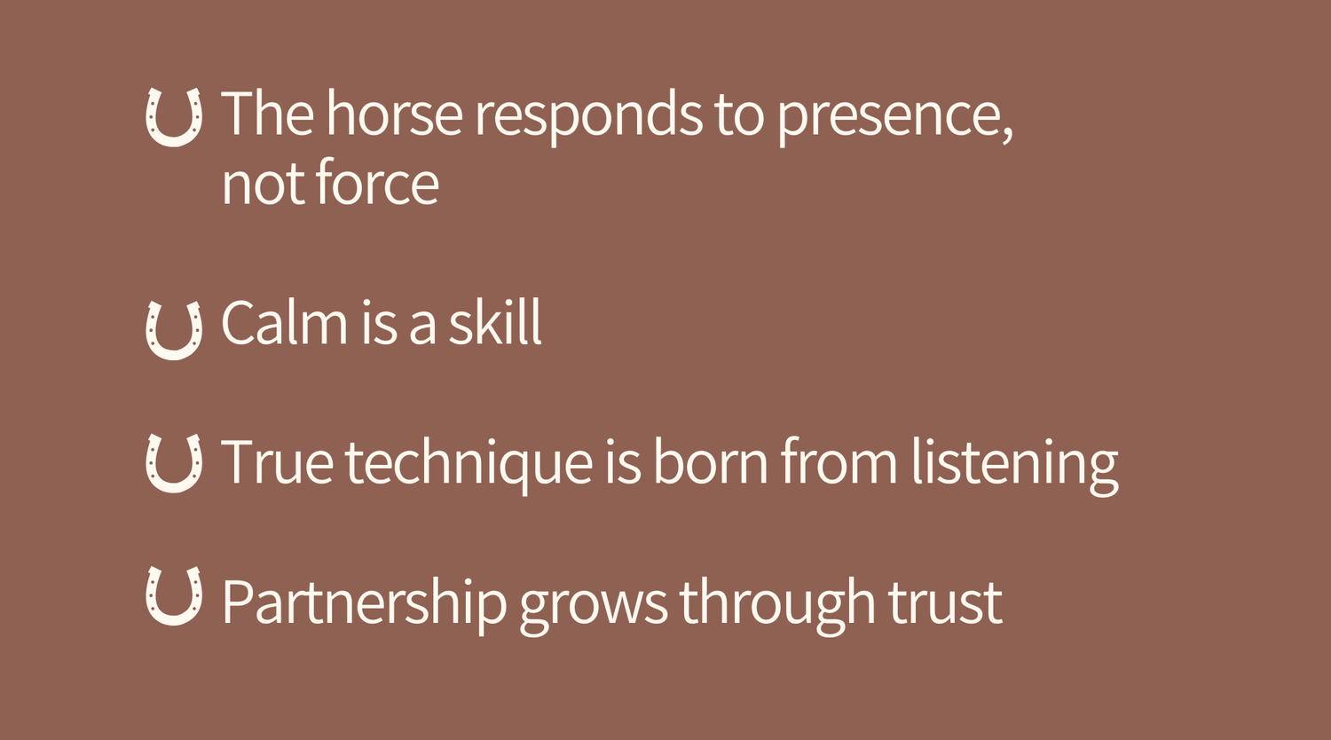 You’ll find principles and awareness practices that transform your presence and the way the horse responds to you: listening, trust, clarity, calm leadership.